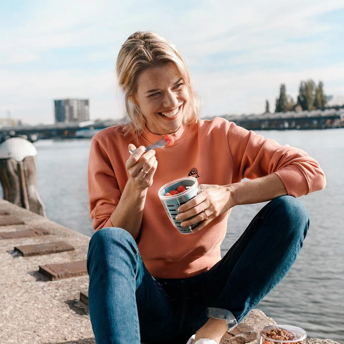 Mepal – Fruit-& Veggie Pot Ellipse – Fruitbox Voor Onderweg – Nordic Pink – Voorzien Van Vergietje En RVS Vorkje