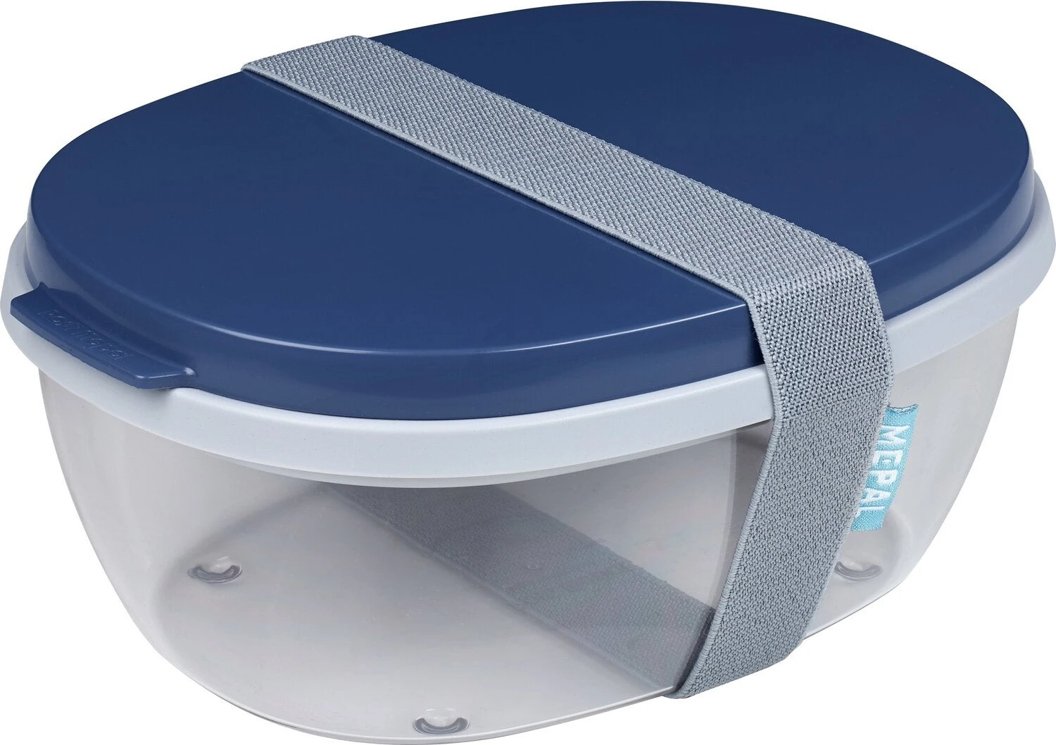 Deze saladbox Ellipse van Mepal is groot genoeg voor een (maaltijd)salade. De transparante box met blauwe deksel heeft voldoende ruimte om de salade op het moment van eten te mengen. Het compartiment biedt plaats aan brood of bestek en in de kleine mini box worden dressings of pijnboompitjes meegenomen. De saladbox Ellipse is vrijwel onbreekbaar en mag in de vaatwasser.